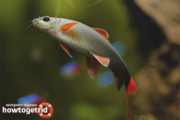 - Според външните данни тази риба е подобна на другата - двуцветна лаборатория. Но различен цвят, за да не бъркате. Формата на тялото на рибата е подобна на акула, така че понякога се нарича дъга. Размерът на Labeo достига 15 см, което се отнася до средната стойност.