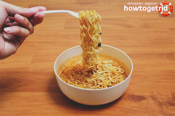 Такива продукти съдържат само въглехидрати. Протеини, витамини, минерали отсъстват.Може би много хора харесват вкуса на мигновени юфка, но няма полза от това. В допълнение, постоянната употреба може да причини следните заболявания: