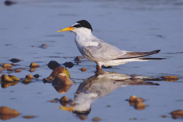 Малката рибарка не надвишава размера на стадото и има достатъчно енергия и ентусиазъм за всички. Отличителна черта - бяло чело и ивици над веждите. Гърбът е сив, цветът на корема е по-светъл. Ярък жълт клюн с чист черен връх е поразителен. Той е доста остър, тъй като птицата търгува с риба, гмуркайки се над нея.