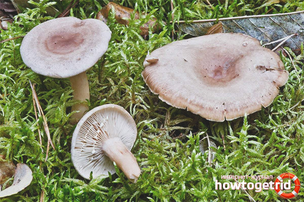 - Още един условно годен за консумация образец, който расте до 9 см в диаметър на шапката. Горната част е оцветена в лилаво, сиво или лилаво. Може да е сиво-кафяво, но с времето става белезникаво. Малко издува, а след това изравнява.