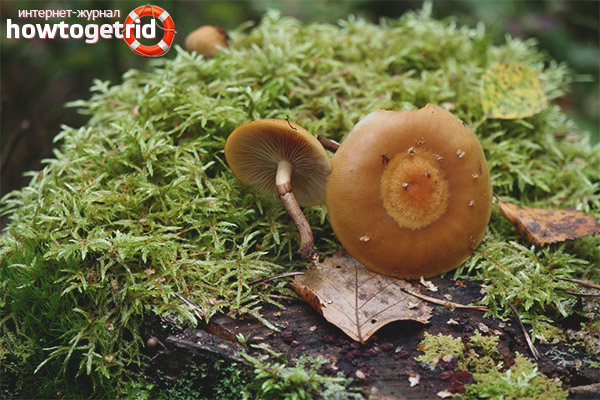 - Сяра жълт фалшив набъбване. Основният цвят на този отровен вид гъби е жълт с характерен сивкав оттенък, капачката има червеникавокафяв връх, плочите са тъмно зелени. На крака няма пръстен. Тази нежива гъба расте в малки колонии, плодовият сезон - от юли до първата слана. Формата на звънец под формата на камбана с изпъкнали ръбове.Месото е светло с жълтеникав оттенък, има неприятна миризма и много горчив вкус. Спорите са кафяви.