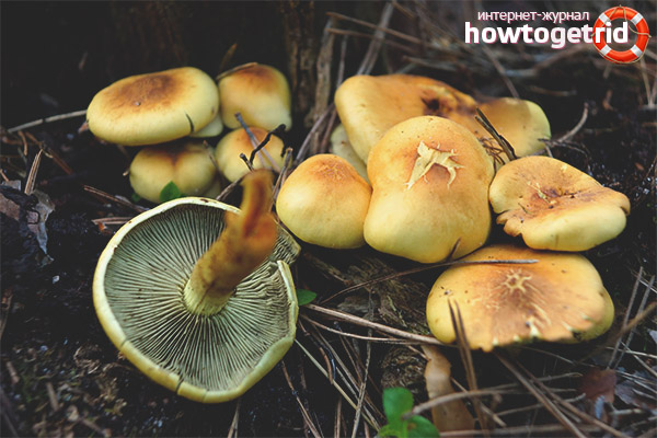 - Сярна жълта материя - тази гъбичка има жълто-кафяв цвят с черни плочи, мембранният пръстен на крака липсва, жълтеникавата плът има характерна неприятна миризма, горчива на вкус. Този вид е много отровен.