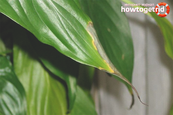 Знаци. Първо, върховете на листата на цялото растение стават жълти. След това те умират много бързо. С течение на времето щетите се разпространяват по цялата повърхност на листата. След това цветът умира.
