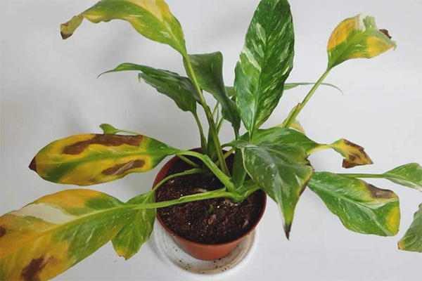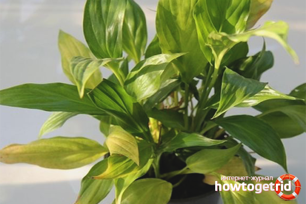 Понякога спатифилът получава достатъчно храна, но листата все още пожълтяват.Причината за това може да се удари на плочата на пряка слънчева светлина. Нещо повече, обичайното дневно слънце е малко вероятно да причини значителни щети. Изгарянията причиняват изгаряща лятна светлина.