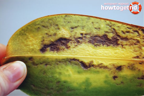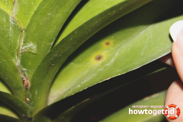 Знаци. Листата се свиват около краищата. Самото орхидея става неразличимо сиво-жълт оттенък. На раменете се появяват виолетови или черни плачливи язви. Стъблото се забива.