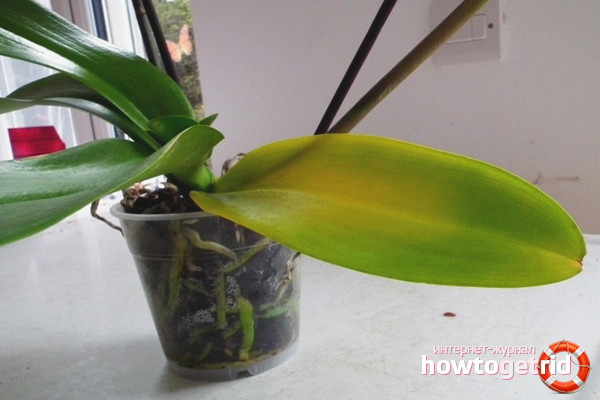 Листата на орхидеите може да станат жълти от факта, че започнаха да гноят корените. Това се дължи на прекомерно натрупване на вода или студени условия. Растението изисква храна, а корените вече не функционират. Изтичането на хранителни вещества от листовете започва.