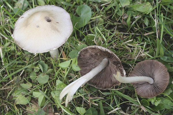 - Пластините на гърба на шапката са разположени един до друг, те се залепват към основата и се пигментират от светло до тъмно кафяво. Всичко зависи от възрастта на определено плодово тяло. Височината на краката нараства до 10 см, изглажда се и е бяла. В редки случаи може да е кафеникава. В долната част на пломбата се забелязва. Самият крак е слаб и често се разпада.