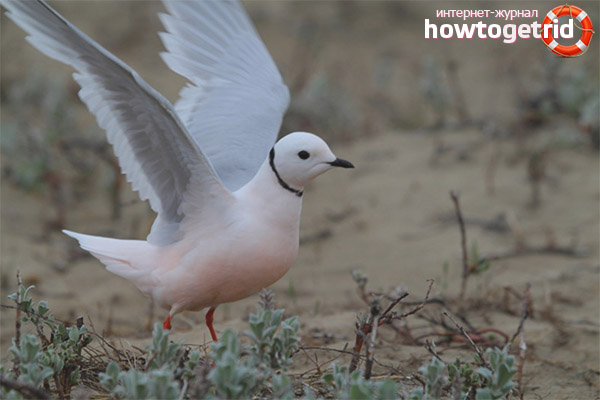 Основната отличителна черта е розовият цвят на корема и гръдния кош, както и елегантната структура на тялото. Гледайки чайка по време на полет, човек може да се чуди само за своята грация и красота. Птицата се издига без звуци, сякаш не е трудно за него. Друга отличителна особеност сред другите чайки е високият глас. Тя може, ако желае, да направи разнообразие от звуци. Птицата не прави тези звуци точно така. По този начин розовите чайки комуникират един с друг. Чрез крещи, други хора разбират, че птицата се притеснява за нещо или, например, в ярост.