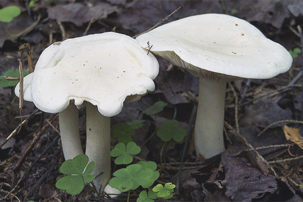 - Шапката е бяла със сив нюанс. Но когато гъбичките стават стари, те се покриват с петна от жълт цвят с точки, тъмни като зърна. Също така, в старите гъби дискът често е напукан или вълнообразен, но в млад, напротив, той е закръглен навътре. С течение на времето върхът на гъбата постепенно се изравнява, докато стане равен. Диаметърът на кръга достига 10 сантиметра.Докосването на капачката не е мокра, а напротив - матово.