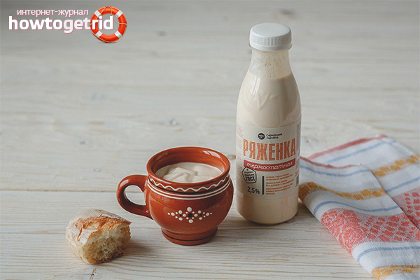 - Ryazhenka се използва за борба с червеи, почиства червата и по-специално цялото тяло.Полезно е продуктът да се изпие, за да се справя с прекаленото шлайфане, натрупването на токсични вещества, радионуклидите.