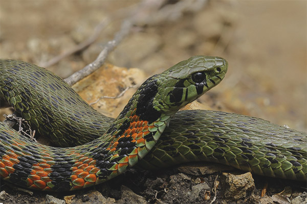- Горната част на тялото няма цвят, който е характерен за абсолютно всички змии. Обикновено пигментацията варира между зеленикави и кафеникави тонове. Змиите могат да бъдат маслини, изумруди, сиви с оттенък на пепел, както и тъмно сиво и кафяво-червено. Има червеникави индивиди и чисто черно. Окончателното оцветяване може да бъде разнообразно или монотонно със или без петна.
