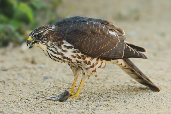 Очите на птици от всяка възраст са с тъмен цвят, с червено-кафяв ирис, който ги отличава особено от другите ястреби.