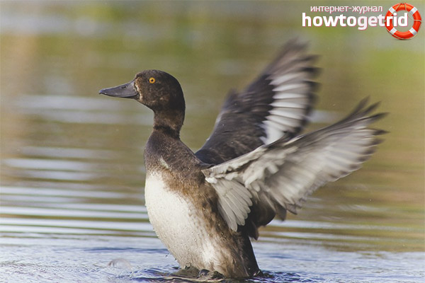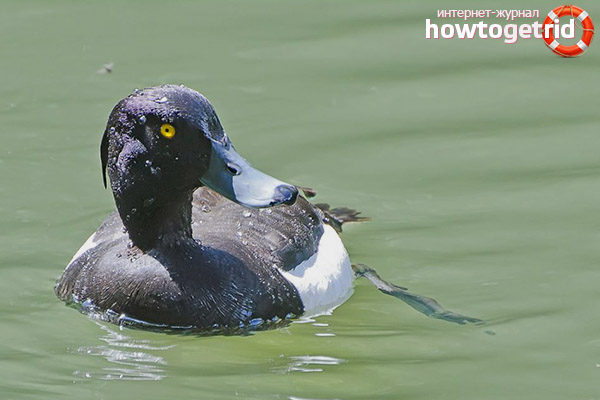 - Представените лица са водолазни патици. Такива птици са в състояние да прекарат дълго време под водата в търсене на храна. Гмуркането се извършва с кратък скок. За да се затъмни, сякаш хвърля врата и се насочи напред. След това птиците потъват до дълбочина.